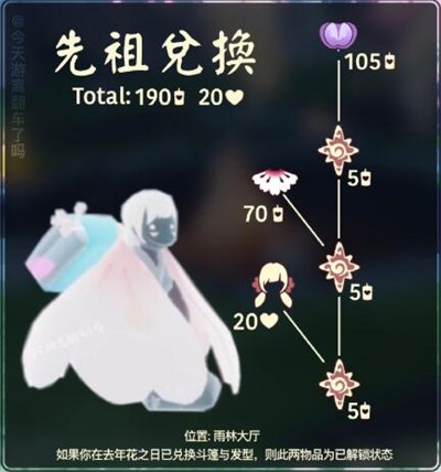兑换物品:2021年的返场物品花羽斗篷、花织发型分别需要70蜡烛、20爱心;2022新款落紫斗篷需要105蜡烛,一共需要190根蜡烛、20爱心。