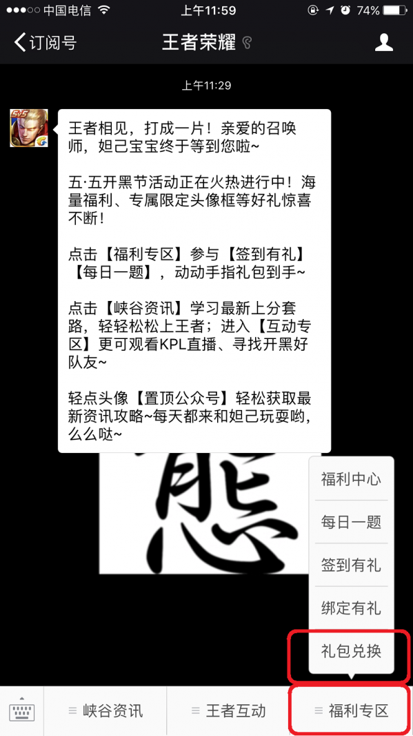 ⒈进入【王者荣耀官方微信公众号】,点击【福利专区】上方的【礼包兑换】;